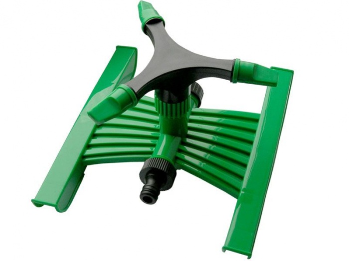 На подставке. 3 сопла. Для стационарного орошения почвы. Площадь полива регулируется поворотом сопел. Два соединительных гнезда распылителя обеспечивают его использование в цепи из нескольких распылителей. Материал: ABS пластик.