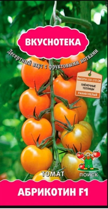 Необычная абрикосовая окраска и великолепный десертный вкус. Раннеспелый гибрид для пленочных теплиц. Период от всходов до начала плодоношения 95-100 дней. Растение индетерминантное, высотой 150-170 см., нуждается в подвязке, формировка в 1-2 стебля с удалением пасынков. Обильный, неприхотливый. Плоды округлые, гладкие, блестящие,  массой 16-20 г, собраны в красивые компактные кисти по 12-14 штук. Окраска желто-оранжевая (абрикосовая). Вкус кисло-сладкий с фруктовыми нотками. Пригоден для уборки целыми кистями.