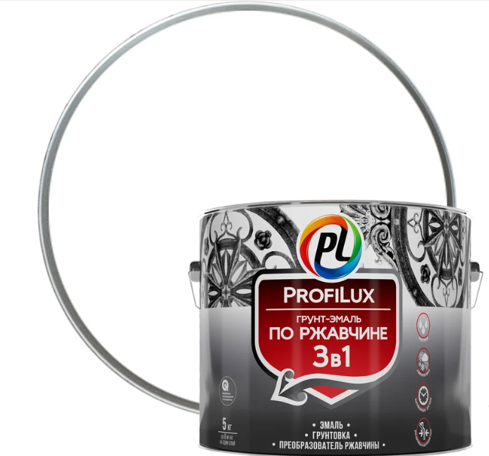 Грунт-эмаль Profilux по ржавчине 3в1 белая 5 кг совмещает в себе функции преобразователя ржавчины, грунтовки и финишного покрытия. Подходит для обработки крупногабаритных конструкций, деталей машин, сельскохозяйственной техники, предметов сложной формы.