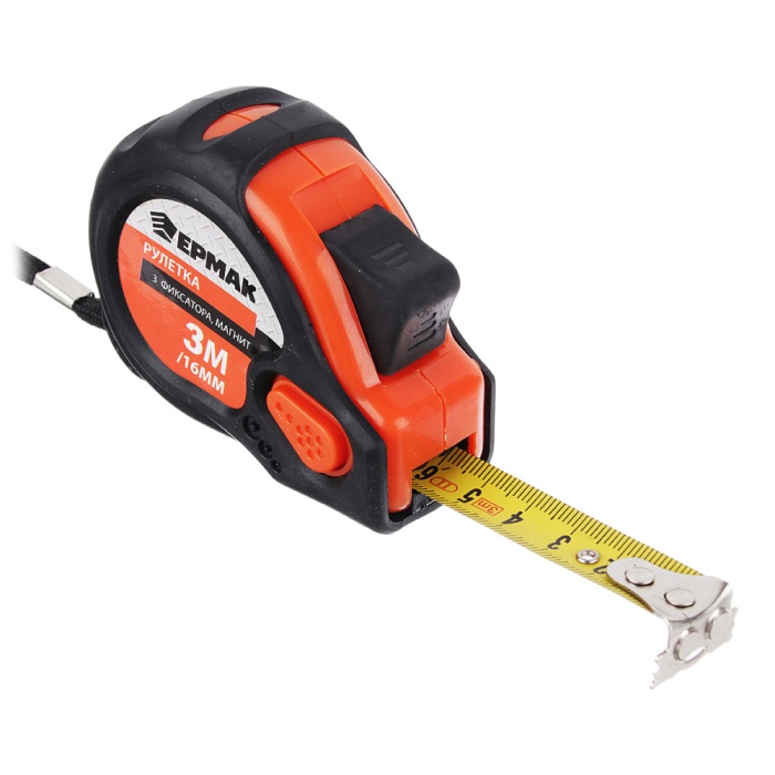 Рулетка ЕРМАК Магнит, 3 фиксатора, обрезиненный корпус, 3мх16мм 658-018 предназначается для проведения измерительных работ. Надежный сматывающий механизм и корпус из ударопрочного пластика обеспечивают долгий срок службы инструмента.