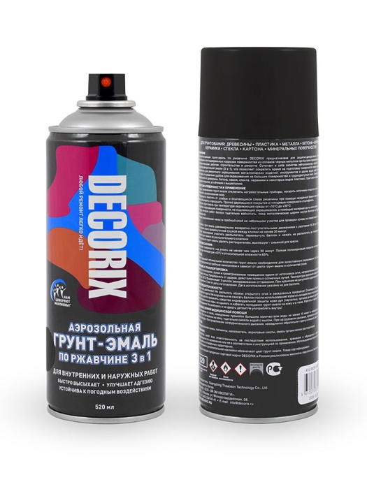 Высококачественная грунт-эмаль по ржавчине DECORIX предназначена для защитно-декоративного окрашивания заржавевших или подверженных коррозии поверхностей из сплавов чёрных металлов при бытовом применении, декоративно-оформительских работах, строительстве и ремонте. Предназначена для окрашивания: древесины, пластика, металла, бетона, кирпича, керамики, стекла, картона и минеральных поверхностей. Сочетает в себе свойства нейтрализатора коррозии, грунтовки и защитно-декоративной эмали, что позволяет сократить время на подготовку поверхности перед окрашиванием. Применяется для ремонтного окрашивания металлических изделий, инструментов и других видов работ. Аэрозольная грунт-эмаль по ржавчине удобна для окрашивания не больших поверхностей и труднодоступных мест. Также подходит для поверхностей из древесины, бетона, камня, стекла, керамики и некоторых видов пластмасс. Грунт-эмаль образует гладкое глянцевое покрытие, устойчивое к выцветанию.