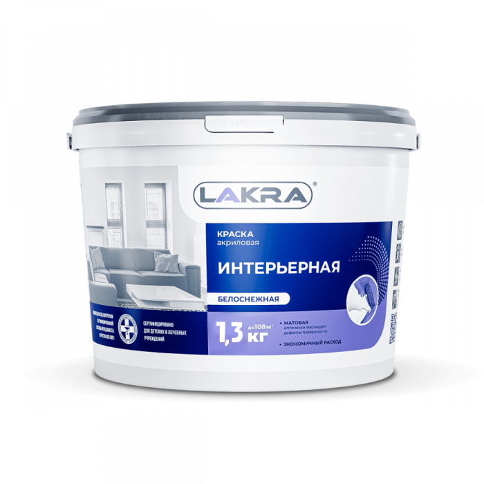 —Краска ВД интерьерная белая 1,3кг ЛАКРА