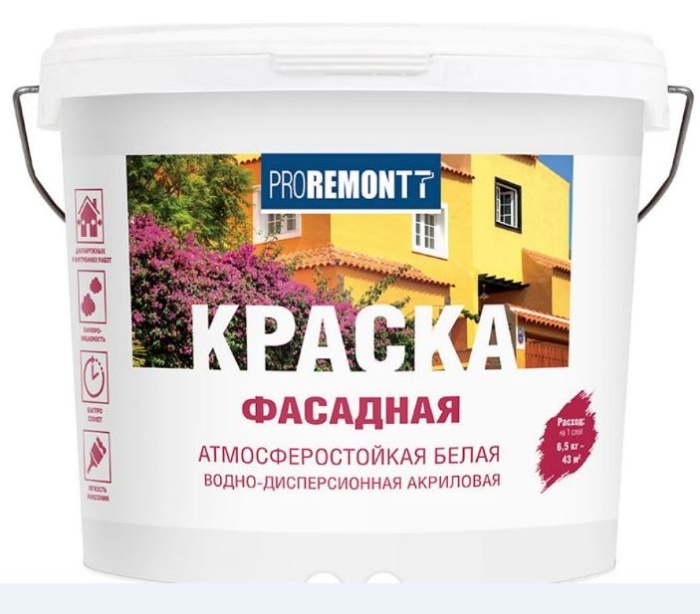 Фасадная краска PROREMONTT белая, 3кг отличается хорошей паропроницаемостью и устойчивостью к влажным уборкам.