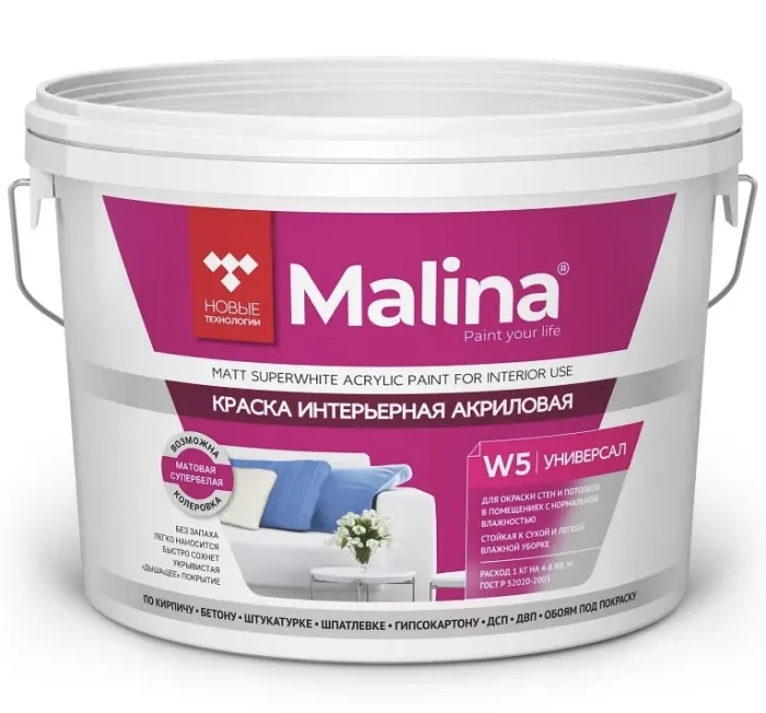 Краска обладает идеальной белизной. Легко наносится на поверхность стен и потолка без подтеков, брызг и разводов. Быстро сохнет.После нанесения образует ровную матовую поверхность.Скрывает микронеровности стен и потолка. «Дышащее покрытие».Не желтеет.Не мелит.Без запаха.Гипоаллергенная.Устойчива к сухой и легкой влажной уборке. Морозостойкая.