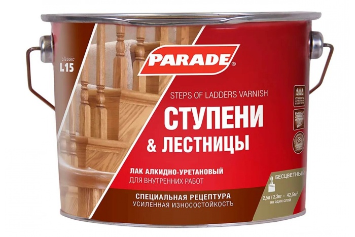 Лак алкидно-уретановый PARADE L15 Ступени & Лестницы матовый.Россия 90003467380 - высококачественный однокомпонентный лак на алкидно-уретановой основе. Образует долговечное прозрачное эластичное покрытие с высокой твердостью и износостойкостью. Надежно защищает древесину от царапин, воздействия воды, бытовых моющих средств, слабых кислот, масел, алкоголя.
