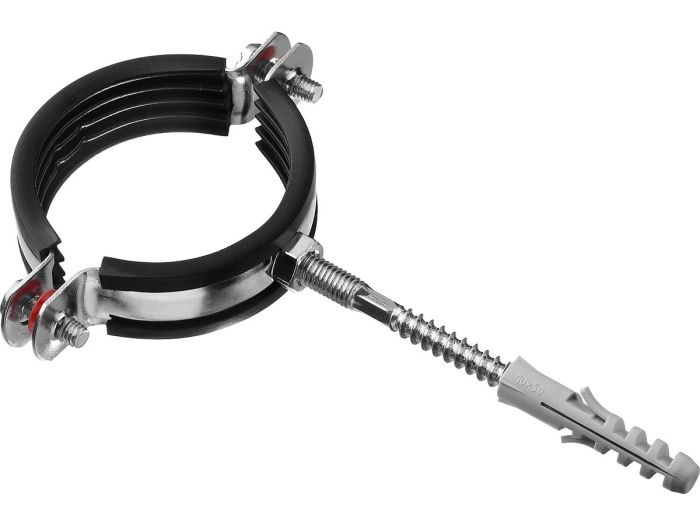 Прочный хомут из качественной оцинкованной стали в комплекте с сантехнической шпилькой и дюбелем для крепления труб различного назначения к любым основаниям. Трубные хомуты  изготовлены из качественной оцинкованной стали, обеспечивают надежное крепление и имеют длительный срок службы.