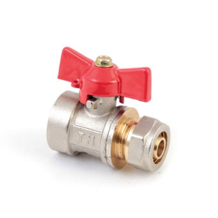 Шаровый кран — применяется для регулировки потока воды, полнопроходной. Корпус выполнен из латуни марки, которая используется во всех высококачественных фитингах. Его ресурс составляет 4000 циклов, что вполне достаточно, если учитывать, что кран открывается и закрывается 1-2 раза в год. Кран-бабочка позволяет сэкономить место в сантехшкафу по сравнению со стандартным краном-ручкой. Имеет с одной стороны внутреннюю резьбу 1/2.