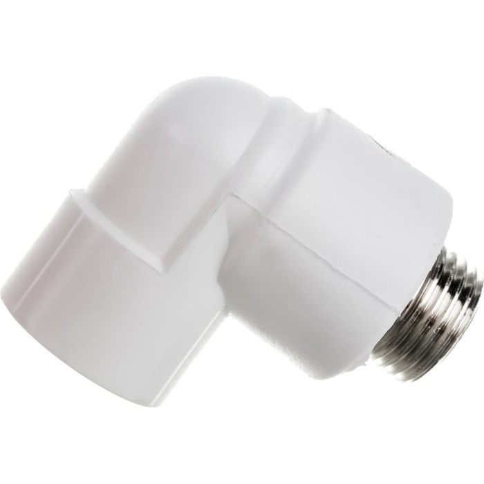Угольник комбинированный с креплением PP-R, наружная резьба, предназначен для подсоединения к полипропиленовому трубопроводу сантехнического смесителя или другого компонента инженерной системы с резьбовым подключением.