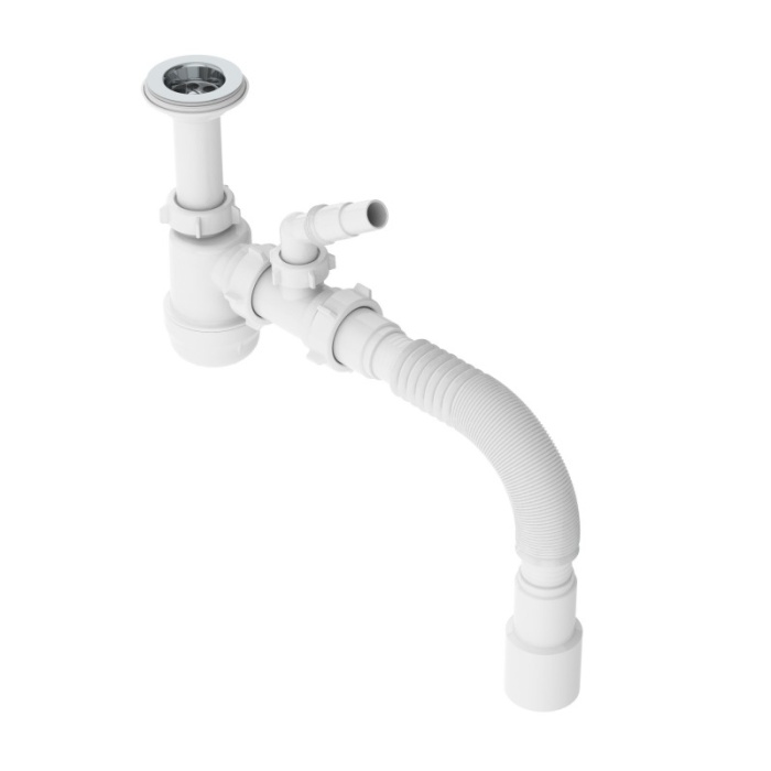 Идет в комплекте с специальным патрубком с отводом для подключения стиральной машины и гофротрубой с универсальным выходом под два диаметра 40/50мм для подключения к канализации.