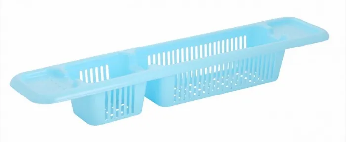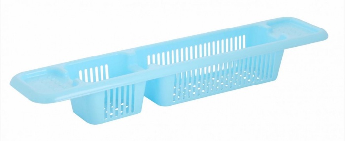 Полка для ванной станет идеальным решением для хранения ванных принадлежностей при купании в ванной. Полка устанавливается на ванну. Конструкция полки имеет два отсека с отверстиями, благодаря которым вода не будет скапливаться. Также на бортиках есть углубления для мыла с ребристой поверхностью, благодаря которой мыло не будет выскальзывать.