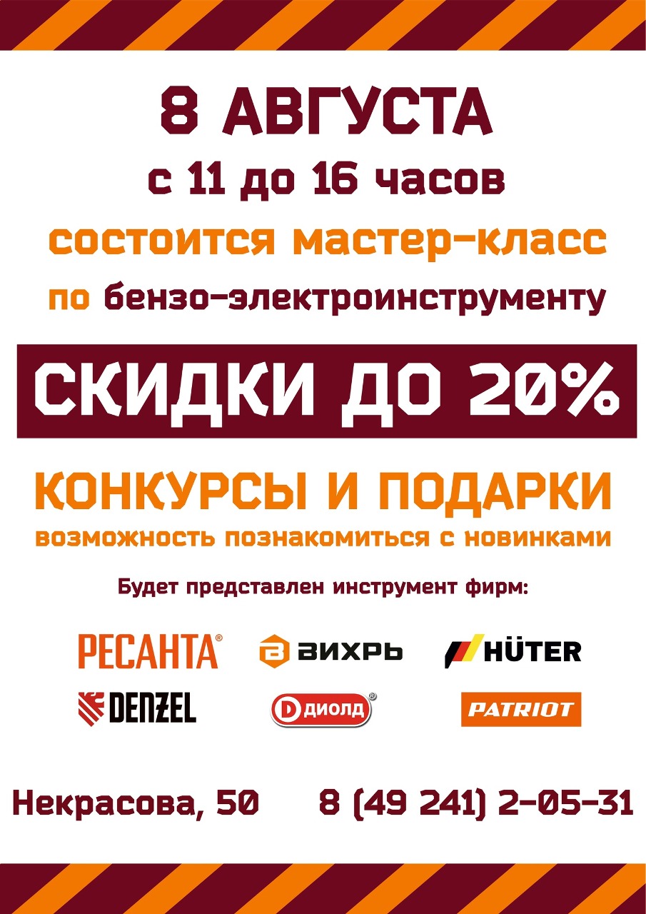 ЧТО: Состоится мастер-класс по бензо-электроинструменту. Будет представлен инструмент фирм: РЕСАНТА, ВИХРЬ, HUTER, DENZEL, ДИОЛД, PATRIOT.
